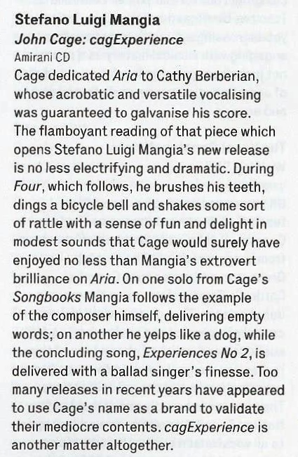 Cage ha dedicato “Aria” a Cathy Berberian, la cui vocalità acrobatica e versatile fu garanzia per galvanizzare la sua partitura. L’interpretazione fiammeggiante con il quale ha inizio il nuovo Cd di Stefano Luigi Mangia, non è meno elettrizzante e drammatica. Durante “Four”, la composizione che segue, Mangia si lava i denti, suona un campanello di biciclette e scuote una specie di sonaglio, con un senso del divertimento e del piacere dei suoni modesti che Cage avrebbe sicuramente apprezzato non meno della brillante ed estroversa interpretazione della precedente “Aria”. Su un Solo estratto dal “Songbooks” di Cage, Mangia segue l'indicazione del compositore stesso, offrendo parole vuote; nell’altro Solo, invece, guaisce come un cane, mentre la canzone finale, “Experience n.2”, è eseguita con la finezza del cantante di ballads. Troppe pubblicazioni discografiche negli ultimi anni sono apparse utilizzando il nome di Cage come un marchio per convalidare i loro contenuti mediocri. CagExperience è tutta un’altra questione.