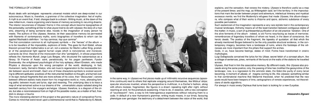 Ulysses is therefore useful as a map of the present times: and the map, as Wittengstein said, isn’t the territory. In theimprovisations that mark the border between project and adventure, intellectual itinerary and mystical excessus mentis, we find the Modernity’s refugees that made Ulysses, this album-diaspora, who compare what of their works is rhizome and spore, alchemic substance of every possible permutation.Such esotericism of the imagination represents a very rare stylistic trait in the contemporary musical landscape. Alchemy means art of the least transition between contiguous states of the matter; in music, a sort of quintessential purification of an old practice: Variation. One of the alive ferments of the album indeed, is old Forms resurfacing as traces of memories: remembrances of legendary travellers of whom we heard, in the dawn of conscience, the heroic deeds.