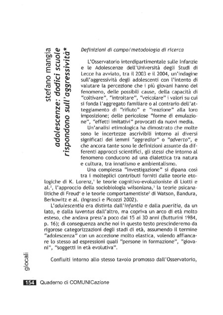S. L. Mangia, “Adolescenze: dodici scuole rispondono sull’aggressività”, in AAVV, “Quaderno Di COMUNICazione. Riconoscere/riconoscersi”, N° 4, Besa Editrice, Nardò, 2004, pp. 154-170.